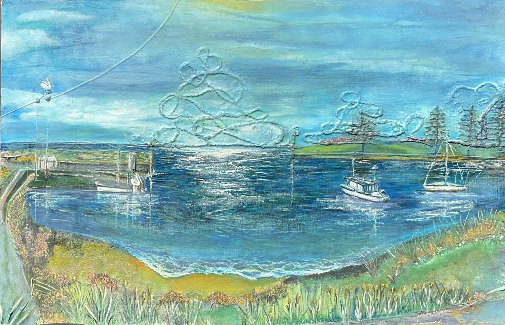 Working with collage, acrylic, oils and resin, Gennifer creates richly layered works that blend the natural and human-made worlds. Drawing on recycled and found materials, her art embraces imperfection and transformation, inviting viewers to slow down and explore the hidden details and subtle narratives within each piece.